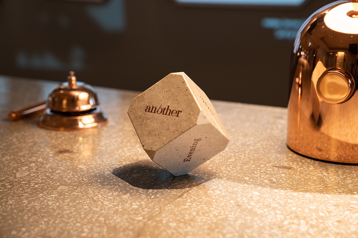 ホテルのレセプションの背景としてのインフォメーションボードとしてその場に溶け込むコンセプトとして、デスクに設置されたサイコロ状のオブジェの向きを変更することで、宿泊客のニーズに応じた施設内情報を提示する情報を提供。レセプションを手続きの場としてではなく、ホテル全体の体験の入り口して、日常から非日常への演出を目指した。